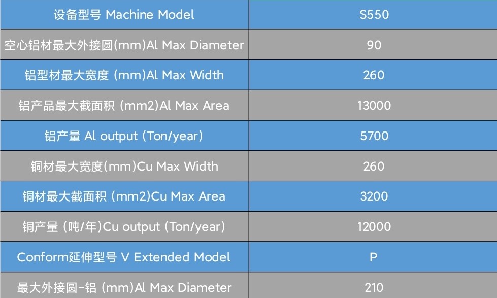 Conform 機型用于生產大尺寸的鋁材,銅母線和銅的型材,Conklad用于大尺寸的鋁包覆和護層,一般的機型結構都適用于Conform或Conklad的操作。